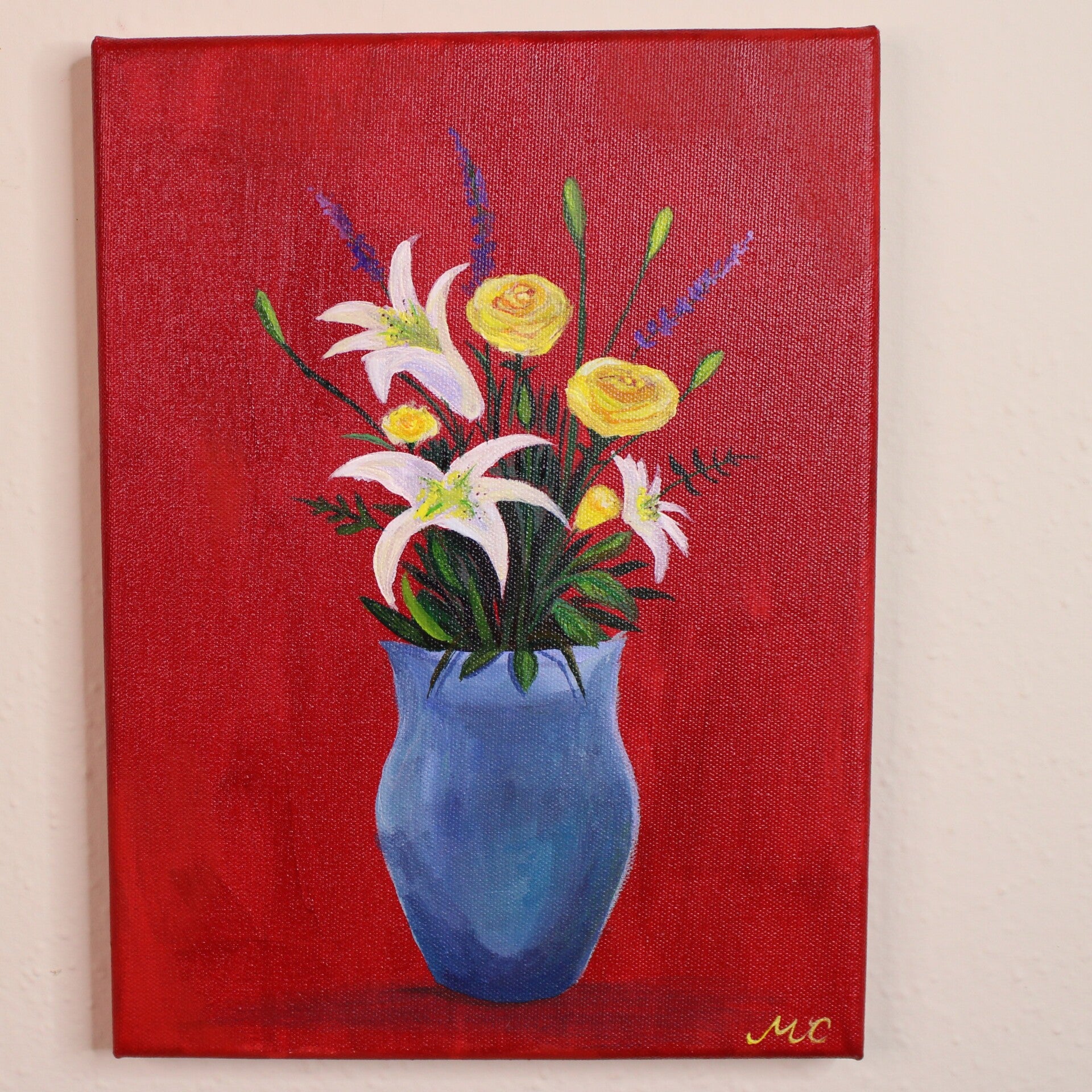 then i added the blue vase as a place to stay. Something steady and calm inside all the intensity of red. I didnt want this piece to feel overwhelming but balanced, a softness you could settle into.